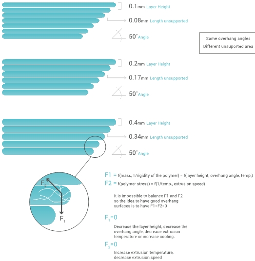 Los principales factores que afectan estas fuerzas se resumen arriba; sin embargo, en términos generales, las mejores superficies de voladizo se obtendrán con una altura de capa alta (más rigidez), baja velocidad de impresión (extrusión más consistente) y alta tasa de extrusión (extrusión más consistente).