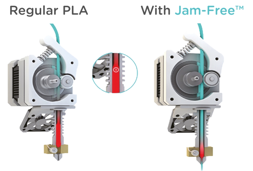 El PLA es el más propenso a tener este problema porque tiene una Tg muy baja (~60˚C), por lo que si la temperatura aumenta ligeramente por encima de 50˚C, ya puede crear un riesgo de atasco. El filamento de 2,85 mm está menos afectado por este problema porque es lo suficientemente grueso como para mantenerse más rígido que el de 1,75 mm.