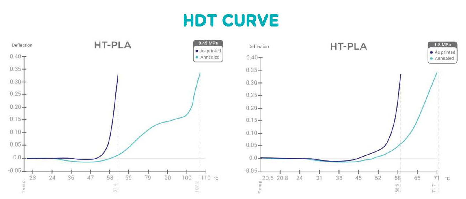 HT-PLA의 곡선은 어닐링이 왜 중요한지 잘 보여줍니다.