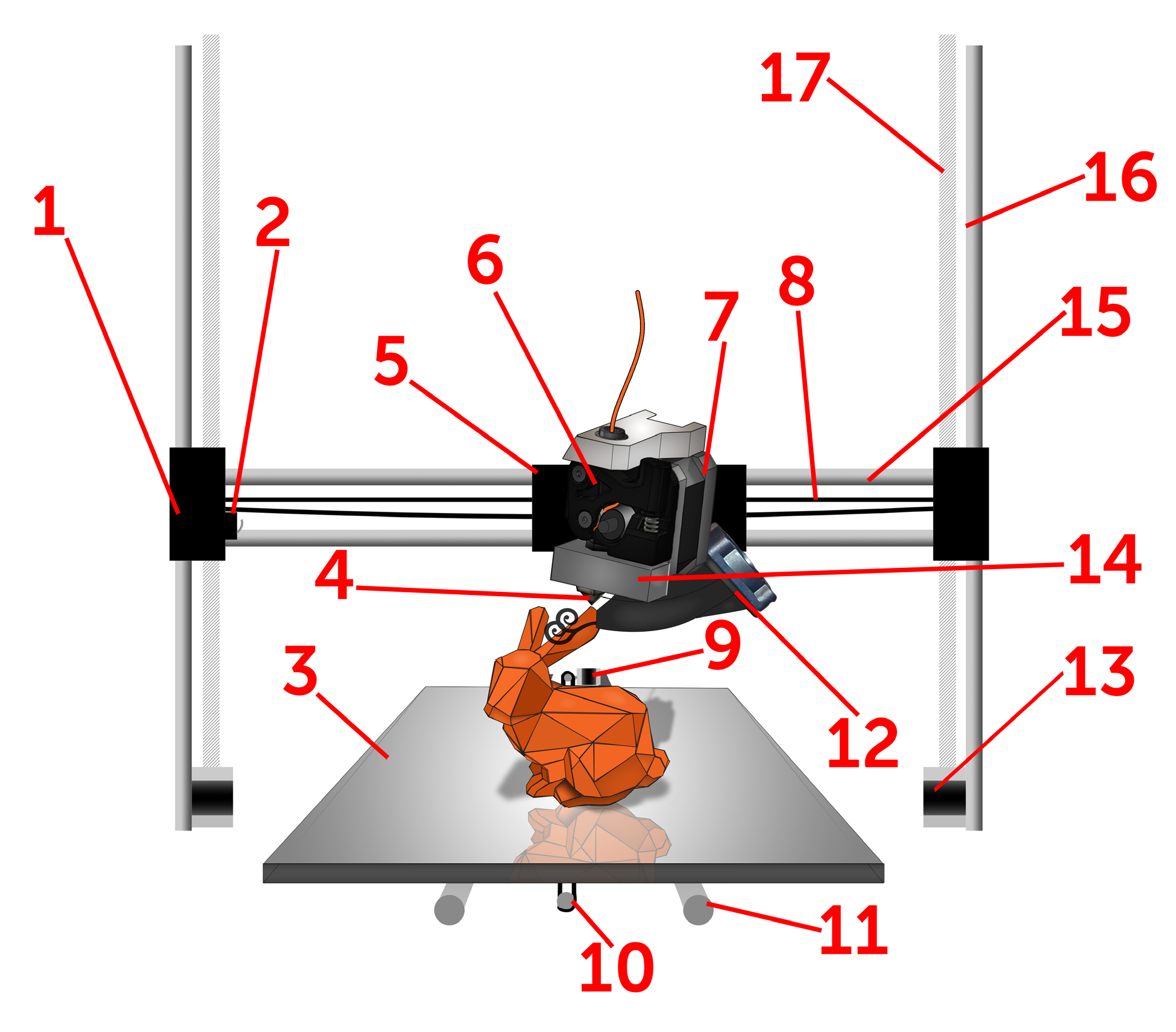 Carro Z: conecta-se tanto à haste Z quanto ao fuso roscado. O fuso gira com o motor de passo e move o carro X para cima e para baixo. Em máquinas Bowden, a extrusora muitas vezes fica montada aqui.