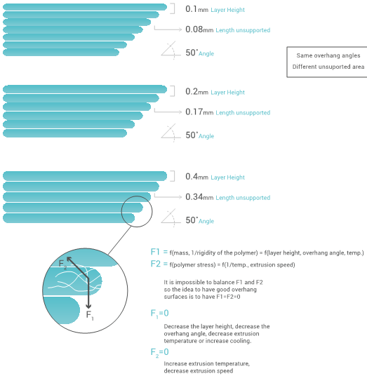 The challenge when printing overhang surfaces is the amount of actual unsupported area. As you can see below the same angle can give different unsupported area depending on the layer height. It can appear that the smaller the unsupported area the better, however the smaller the layer height the less rigid the unsupported area will be. It will always be a balance between rigidity and amount of unsupported area.